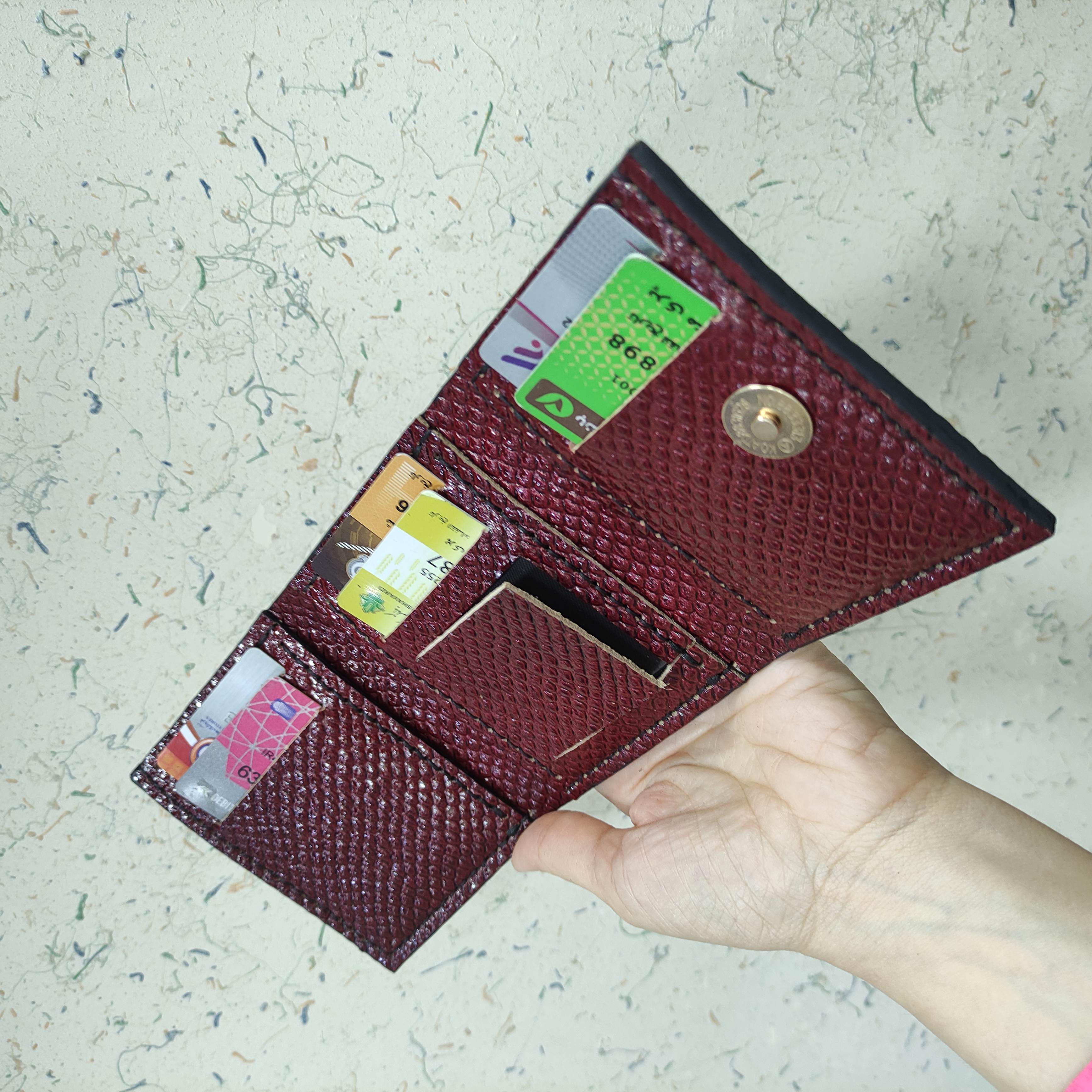 کیف پول سه لت،جای 6عدد کارت داره،یه جای عکس و پول داره،سه جیب مخفی برا پول،کارت و.. داره،کاملا دستساز و دستدوز،از چرم گاوی ساخته شده